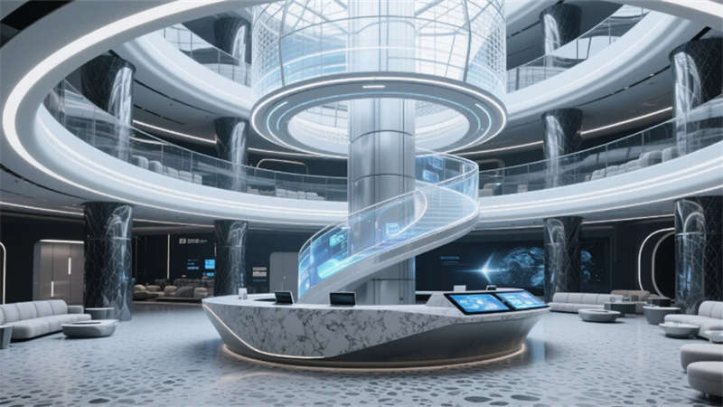12米挑空通高中庭作為空間樞紐,幻影灰水磨石地坪與曲面碳纖維立柱構成星際基地般的視覺震撼,三層透明LED環屏與智能光膜系統實現信息交互與自然采光的動態平衡。辦公區創新采用蜂窩式可重組艙群,磁吸玻璃隔斷與石墨烯地坪構建靈活辦公單元,AR投影桌與腦波感應椅重新定義人機協作模式。
