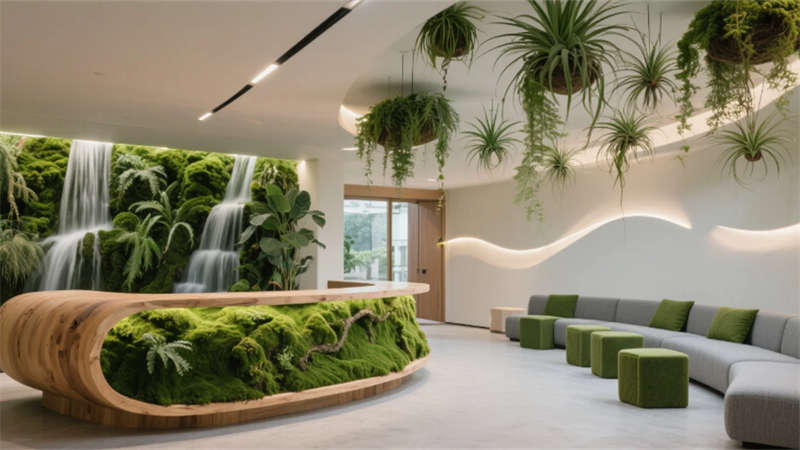 該設計以“自然共生”為脈絡,將綠植生態系統與現代辦公需求深度融合。入口處以苔蘚藝術臺與流水光墻奠定基調,流動的綠意從呼吸幕墻延伸至開放辦公區,原木桌面在漫射天光中模糊室內外界限。獨立辦公室的垂直森林墻與靜音艙的苔蘚隔斷,在私密空間延續生態語言。