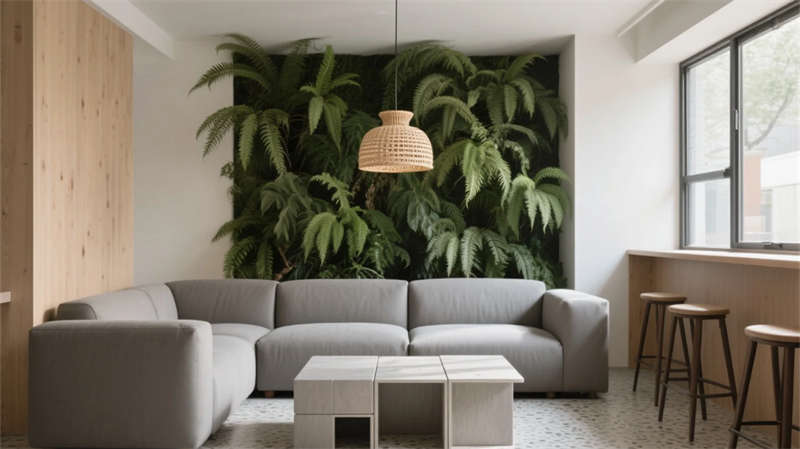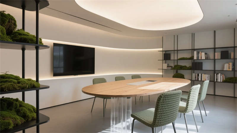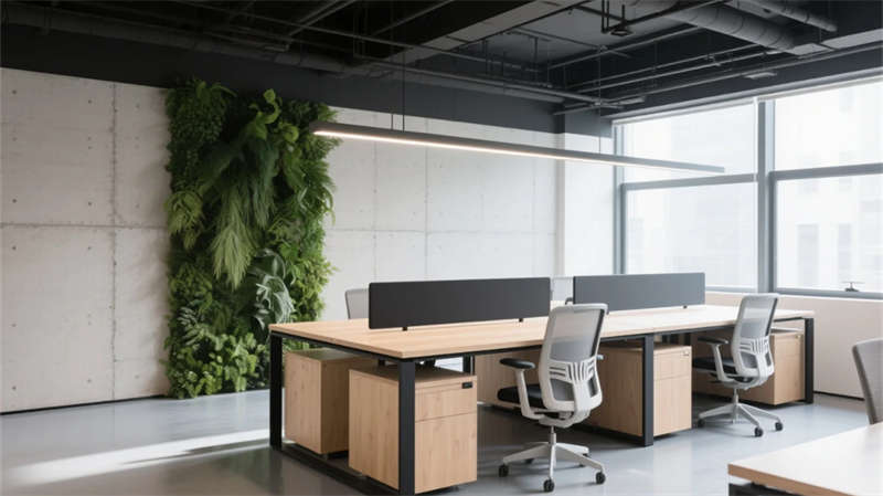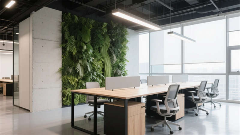 該空間以"自然共生"為脈絡(luò),將輕工業(yè)基因與生態(tài)美學(xué)深度融合。裸露結(jié)構(gòu)的天花與溫潤木元素形成張力,貫穿各區(qū)域的垂直綠植墻如同呼吸脈絡(luò),賦予嚴(yán)謹(jǐn)辦公場景盎然生機。