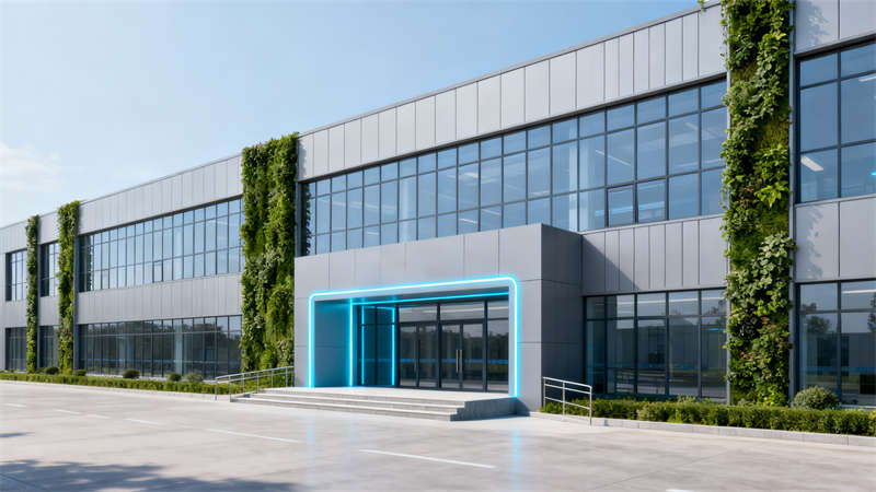 外觀設計上,融合玻璃幕墻與淺灰色金屬保溫板,讓建筑兼具通透感與保溫性能,同時輔以垂直綠化點綴外立面,平衡工業材質的生硬,入口區域注重實用與美觀的結合,方便設備運輸的同時,也提升了廠房的整體形象。