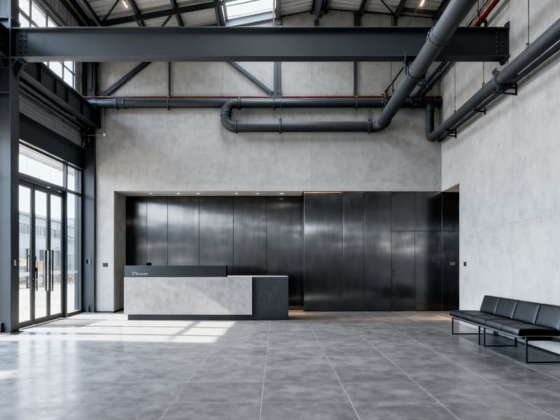 本設計聚焦6000平廠房的工業屬性與實用需求,以現代工業風為核心,打造高效、規范且兼具人文關懷的生產辦公空間。整體色調以深灰、淺灰、黑色為主,搭配局部橙色警示色與淺木色暖調,既契合工業空間的專業質感,又避免環境的冰冷與壓抑。