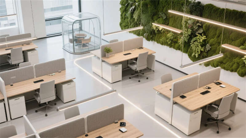 生態科技體系覆蓋全場景:經理辦公室苔蘚墻集成空氣監測系統,總裁室霧化玻璃聯動光伏發電,小會議室綠植墻搭載微滴灌節水裝置。材質選用安徽本土元素升級再造,大廳水磨石摻入大別山礦石粉,定制地毯紋樣提取徽派窗欞數字化變體。