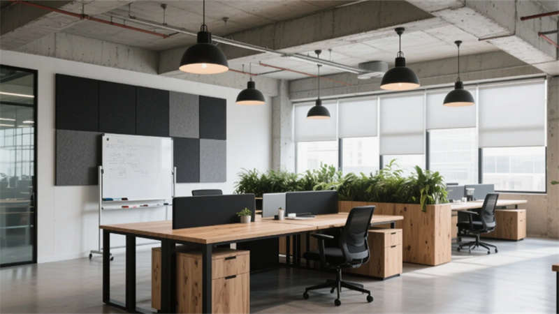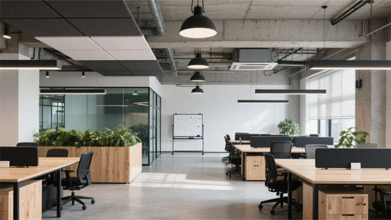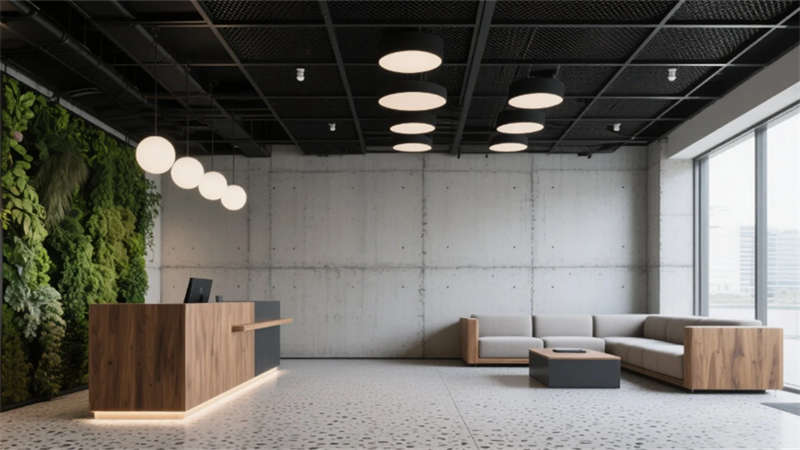 步入大堂,粗獷的混凝土墻面與水磨石地面形成質(zhì)感對話,懸浮金屬網(wǎng)天花下,原木前臺與背光綠植墻暈染出溫潤生命力。開放式辦公區(qū)延續(xù)工業(yè)基調(diào),模塊化橡木桌搭配黑色鋼架,綠植隔斷巧妙劃分空間,自然光穿過智能遮陽簾,在混凝土天花上投下流動的光影詩行。