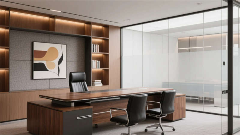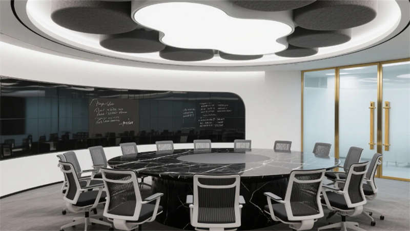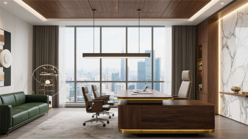 私密空間演繹克制的精致:經(jīng)理辦公室玻璃隔斷內(nèi),胡桃木書桌與毛氈吸音墻平衡理性與溫度;總裁套間則以大理石暗光墻面對話城市天際線,黃銅細節(jié)點亮低調(diào)的尊崇。會議室黑石長桌與磁吸玻璃書寫面碰撞靈感,而公共休息區(qū)陶土花盆與橄欖綠軟墊,在混凝土中島上生長出松弛的煙火氣。