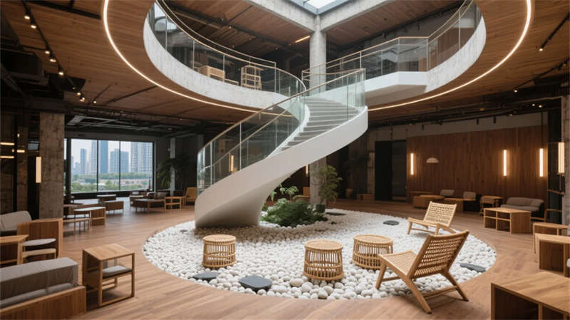 開(kāi)放式核心區(qū)采用模塊化家具系統(tǒng),配合智能照明與聲學(xué)優(yōu)化,兼顧協(xié)作效率與專(zhuān)注需求;階梯沙龍與透明會(huì)議盒子激發(fā)即興創(chuàng)新,可移動(dòng)隔斷實(shí)現(xiàn)場(chǎng)景自由切換。最具特色的是貫穿三層的垂直生態(tài)中庭,旋轉(zhuǎn)樓梯纏繞常綠藤蔓,成為連接空間的活力紐帶。
