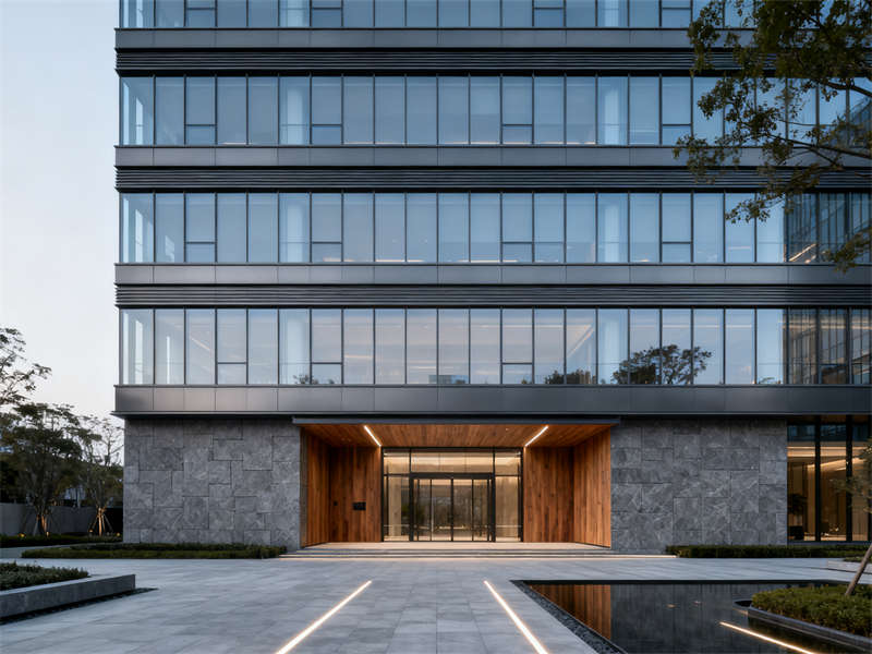 入口大堂以開闊格局為核心,淺灰地磚搭配低飽和木色前臺,弱化厚重感的同時,用金屬線條勾勒細節,讓第一印象既專業又通透。玻璃隔斷貫穿多個區域,在走廊處搭配木色門牌,既保證采光,又通過材質呼應強化整體感,避免空間割裂。