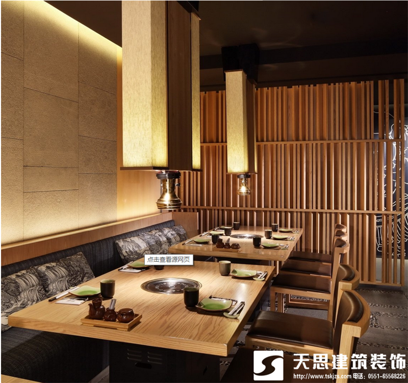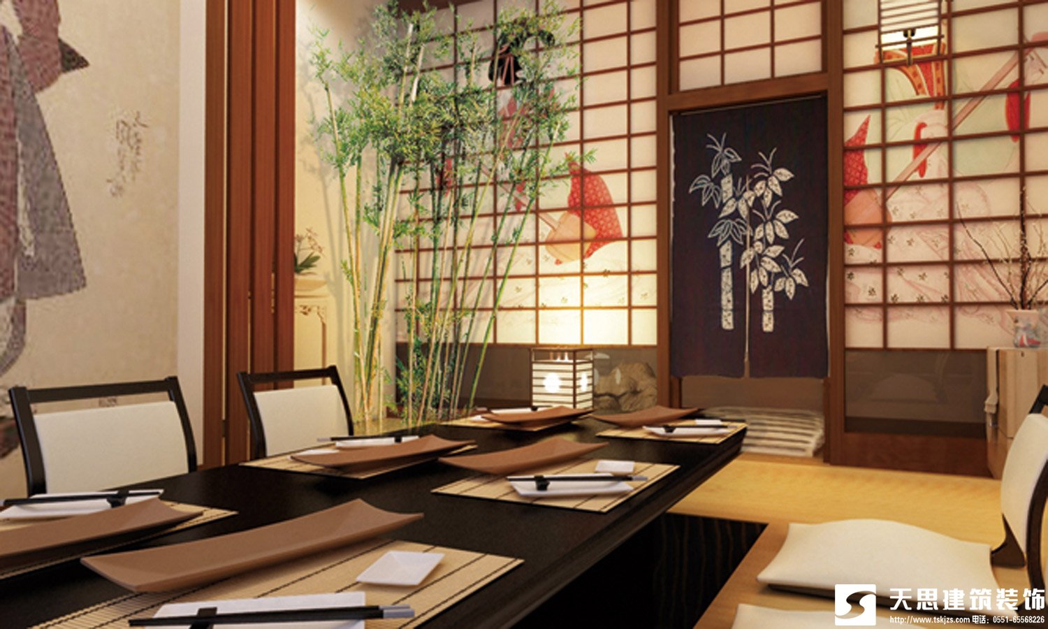在日式風格的設計理念中,設計師一般比較注重體現濃郁的日本民族特色,在選料上注重質感的自然與舒適,常選擇木格拉門、地臺等元素來表現其風格的特征。  設計師除了保持日式餐廳的傳統風格外,更要增添了一些現代時尚的符號。餐廳內部環境雅致且輕松簡約,布局獨具匠心,散發著東方古樸的異域風情。
