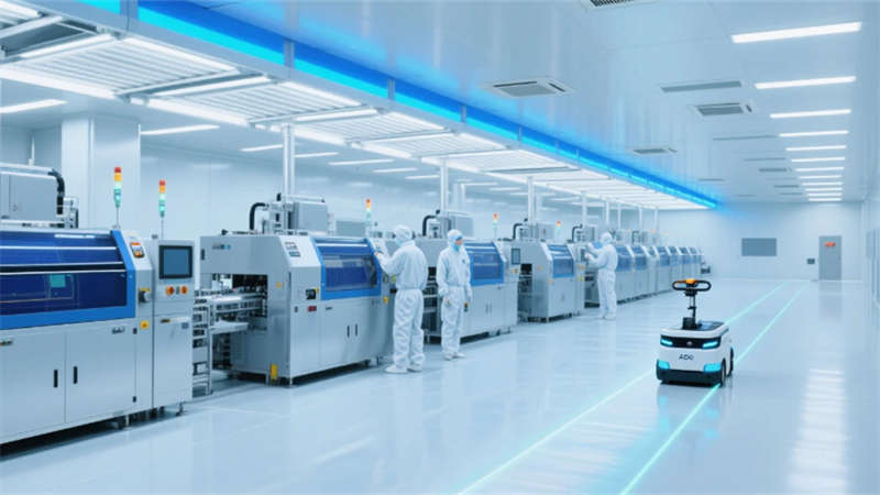 這個潔凈車間廠房,以未來工業美學為語言,詮釋新能源智造的全新范式。通透的玻璃幕墻與菱形光伏屋頂交織,將自然光引入車間,與冷調LED光帶共構科技與生態的平衡。核心生產區如同精密運轉的“硅基心臟”,層流送風系統無聲守護著無塵環境,自動化設備在藍色光暈中有序協作,AGV穿梭的軌跡編織出無聲的效率詩篇。