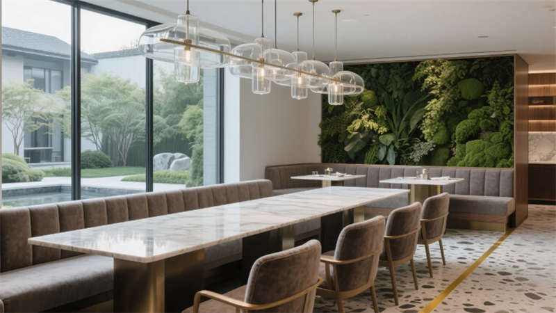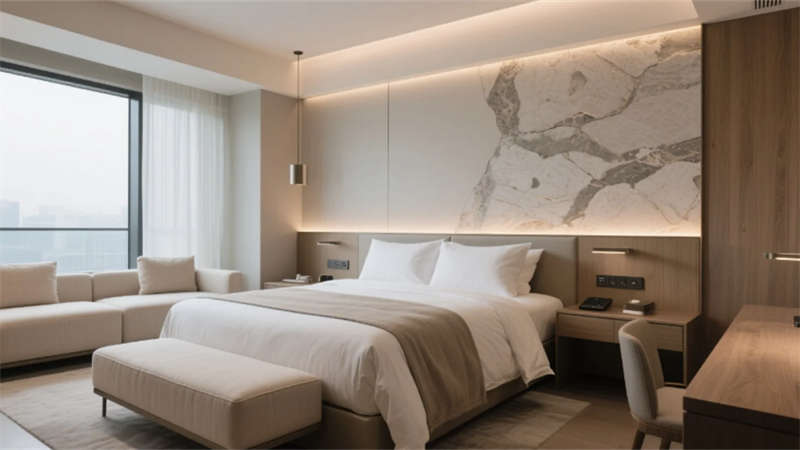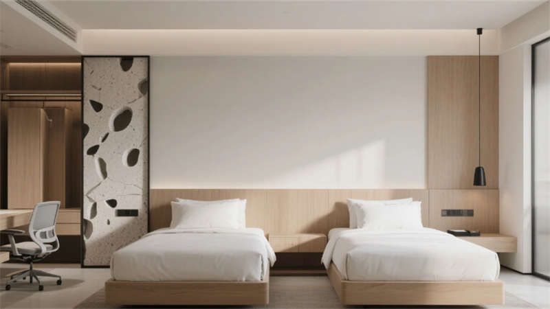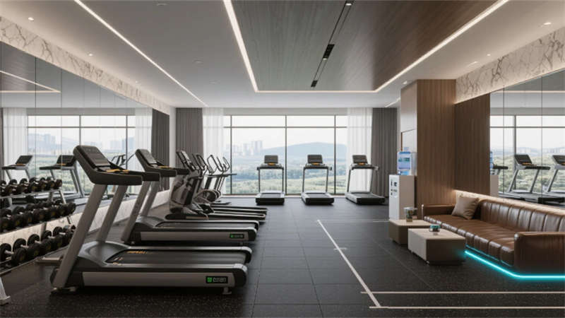 客房以中性色調(diào)為基底,亞麻、柚木與肌理墻面營(yíng)造松弛感,智能化系統(tǒng)隱于無形,從電動(dòng)紗簾到無線充電桌,細(xì)節(jié)中滲透科技溫度。雙床房的可移動(dòng)屏風(fēng)與定制家具,兼顧私密與靈活;衛(wèi)浴空間以霧面玻璃與水磨石打造朦朧質(zhì)感,啞光五金件點(diǎn)綴現(xiàn)代精致。餐廳以共享長(zhǎng)桌與綠植墻激活社交氛圍,水磨石地面鑲嵌的黃銅線條如溪流蜿蜒,呼應(yīng)徽派建筑中的流水意象。健身房鏡面與橡膠地面反射城市燈火,休憩區(qū)的皮質(zhì)軟榻與漸變燈光,為運(yùn)動(dòng)后提供片刻寧?kù)o。