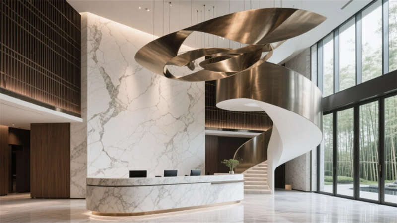 這座酒店以自然與人文的共生為靈感,將徽州山水意境凝練于現(xiàn)代設(shè)計(jì)語言中。建筑外觀以幾何切割的洞石立面與通透玻璃幕墻交織,垂直綠植如水墨筆觸般攀附墻體,入口處鏡面水景倒映天光云影,模糊建筑與自然的邊界。步入大堂,挑高空間內(nèi)懸浮的螺旋樓梯與抽象金屬裝置形成動(dòng)態(tài)視覺焦點(diǎn),暖木格柵與冷冽大理石碰撞出靜謐與奢華的平衡,全景窗將庭院竹林景觀引入室內(nèi),光影隨時(shí)間流轉(zhuǎn)而變幻。