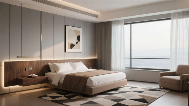 以低飽和度中性色調為基底,這座酒店將現代輕奢美學與在地文化氣韻悄然相融??臻g以胡桃木的溫潤、金屬線條的利落與自然光影的詩意共筑視覺語言,藝術裝置如隱形的敘事者串聯起流動的場域精神。