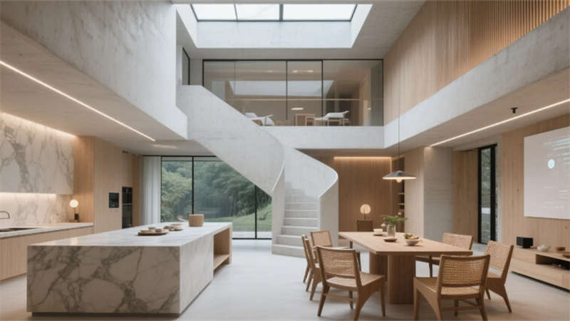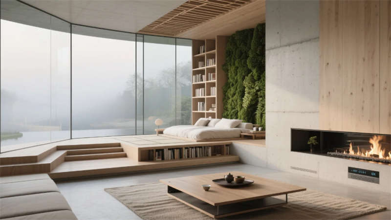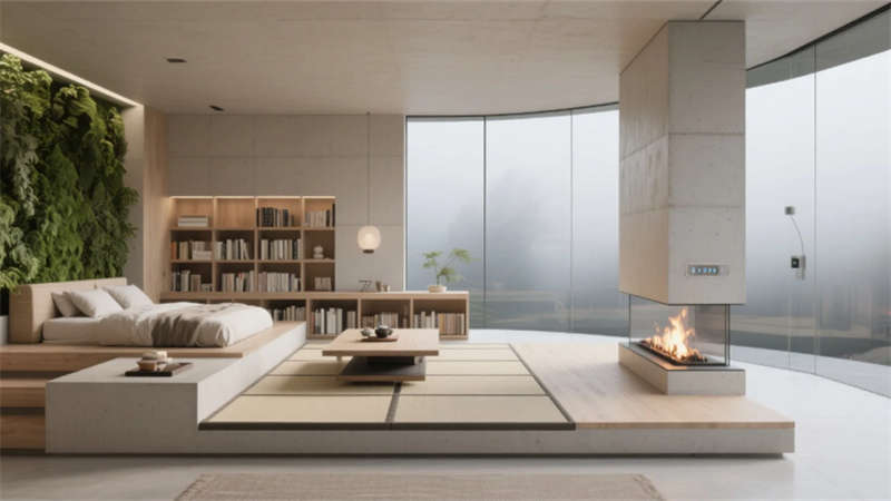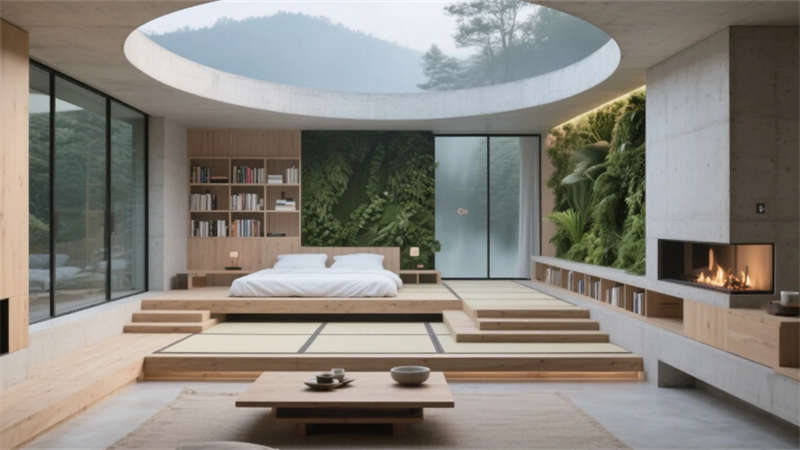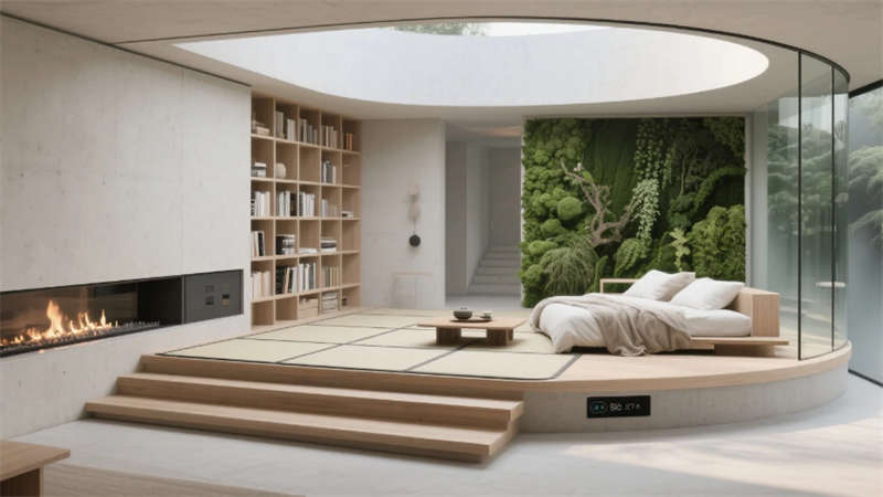 客房以極簡(jiǎn)的智慧回應(yīng)棲居本質(zhì)。榻榻米地臺(tái)消弭床與地面的界限,270°環(huán)景霧化玻璃輕觸即透,仿生綠植在智能光影中呼吸生長(zhǎng),隱藏式投影幕布落下時(shí),星空與林海皆成私享背景。階梯書吧的垂直綠植墻下,模塊化沙發(fā)隨需求自由組合,全息粒子在空氣中勾勒出流動(dòng)的藝術(shù),而巖板中島餐廳里,藤編座椅與吊燈矩陣的光暈交織,智能調(diào)光天窗讓每一餐都浸染著天光的溫度。