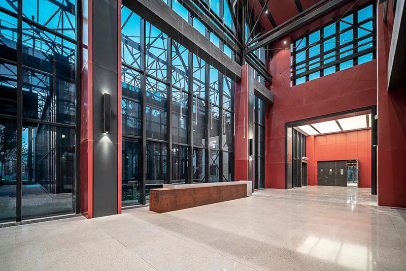 低飽和度紅色鋼板與黑色鋼板形成視覺碰撞,銹板前臺、懸浮燈飾與金屬結(jié)構(gòu)架讓空間闊達(dá)簡練,通高的玻璃幕墻借景舊建筑的殘影,使之成為室內(nèi)裝飾的一部分。