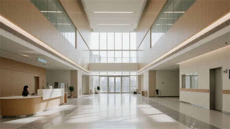 本設計將現代簡約美學注入醫療空間,打造兼具人文關懷與高效功能的療愈環境。通透的玻璃幕墻引入充沛自然光線,淺木紋與灰白色基調營造寧靜氛圍,綠植元素的有機融入模糊了建筑與自然的邊界。