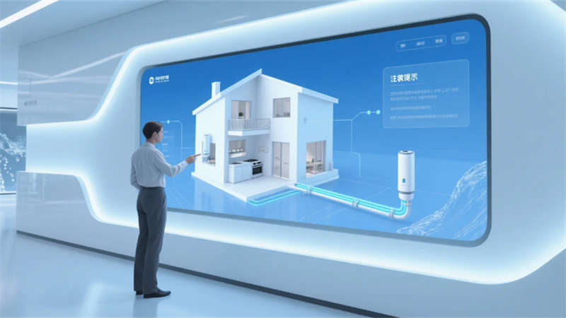 展廳以環形動線串聯六大核心模塊:入口10米寬LED水幕墻動態演繹凈水原理;中央懸浮式產品矩陣展臺,通過全息投影拆解RO膜過濾技術;實景化場景區1:1復刻家庭廚房、商務辦公樓及工業廠房,搭配交互式水質監測實驗臺;獨創的“虛擬管家”AR系統,可生成個性化凈水方案并投射至合肥典型戶型模型。空間頂部采用參數化設計的波浪形燈網,象征長江與淮河水系交匯,地面嵌入城市節水數據可視化地磚,凸顯本土環保責任感。