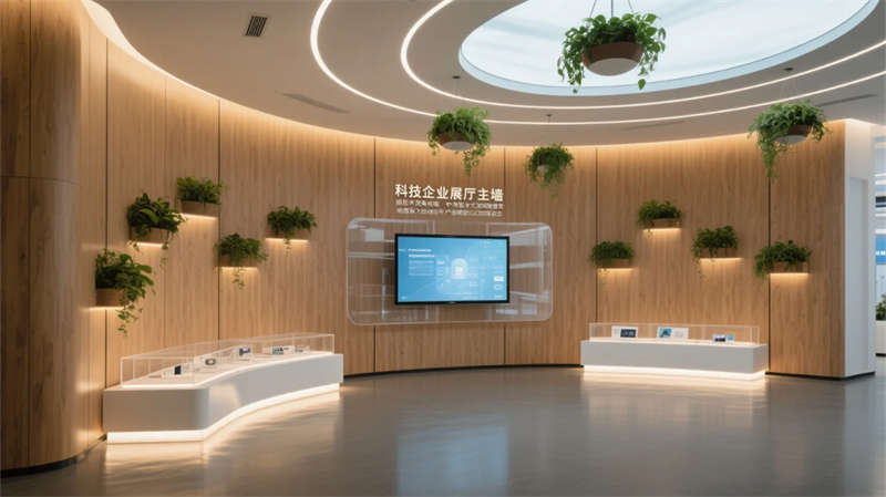該展廳以“科技與自然共生”為理念,打造具有呼吸感的未來辦公展示空間。暖灰木紋肌理與流動曲線構筑空間骨架,智能光帶如脈絡貫穿始終,在冷調科技感中融入垂直綠植與天然材質,平衡數字時代的溫度需求。
