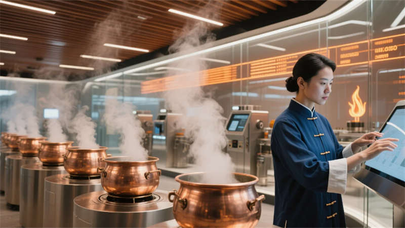 露天庭院白石鋪就太極紋路,素衣身影在紫竹霧靄間起勢推掌,漏窗剪出晨練動態(tài)。名醫(yī)診室紅木案上脈枕微溫,博古架藥材標本與滿墻醫(yī)典沉淀千年智慧。智慧煎藥中心的銅鍋陣列于胡桃木頂下吞吐蒸汽,光影交織傳統(tǒng)與現(xiàn)代。